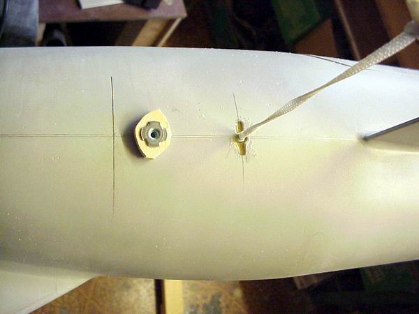 Es wird ein Spalt gefräst, wo man die in einem kleinen Stück Sperholz gefasste Einschlagmutter quer durchschieben kann. Zuvor wird durch die Mutter ein Bindfaden gesteckt, am anderen Ende ein dicker Knoten, mit dem die Mutter an die Innenwandung gezogen wird.