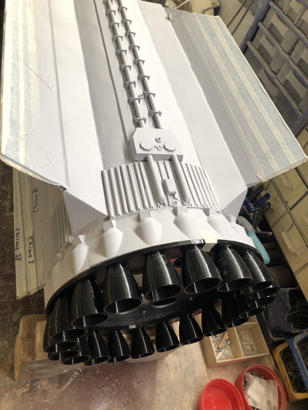 Der Booster ist nun fertig und bereit zum lackieren. Ralf hat da nochmal mit seinem 3D-Drucker einen drauf gesetzt. Jetzt sieht das Heck erst mal so richtig geil aus! Der Triebwerkskranz ist leider nur ein Hingucker und wird am Ende nicht mitfliegen, weil die Druckteile die Abgase aus den Clustermotoren nicht überstehen würden. Der Kranz wird nur zur Show mit Magneten angeheftet. Grüße Rolli