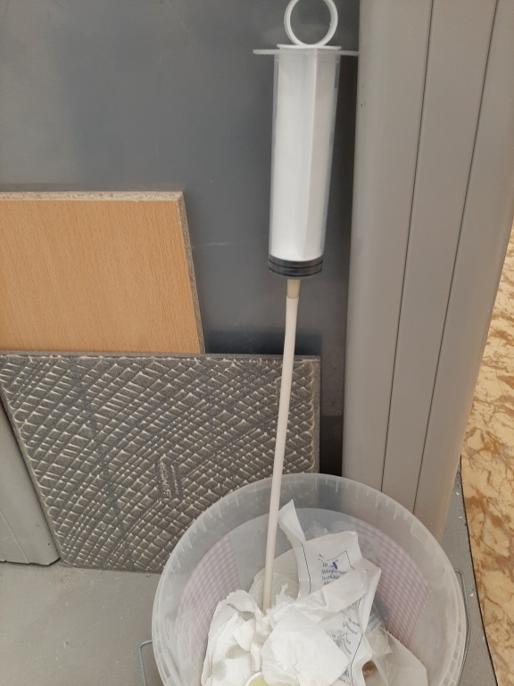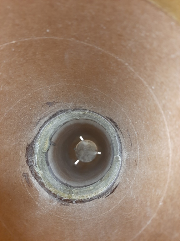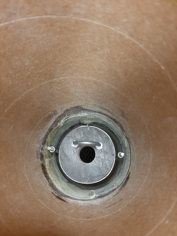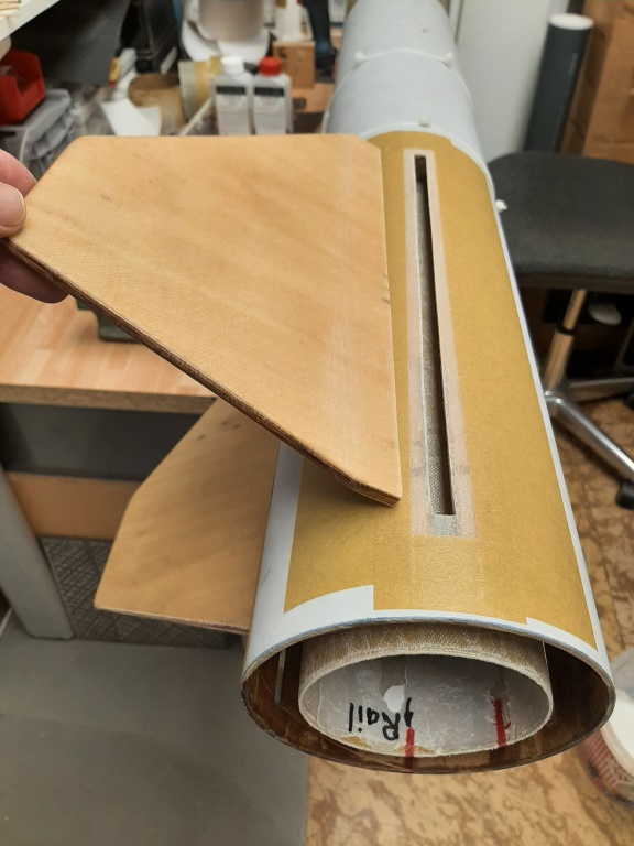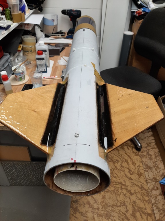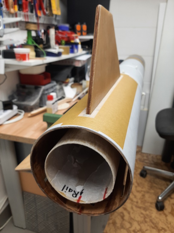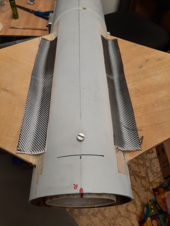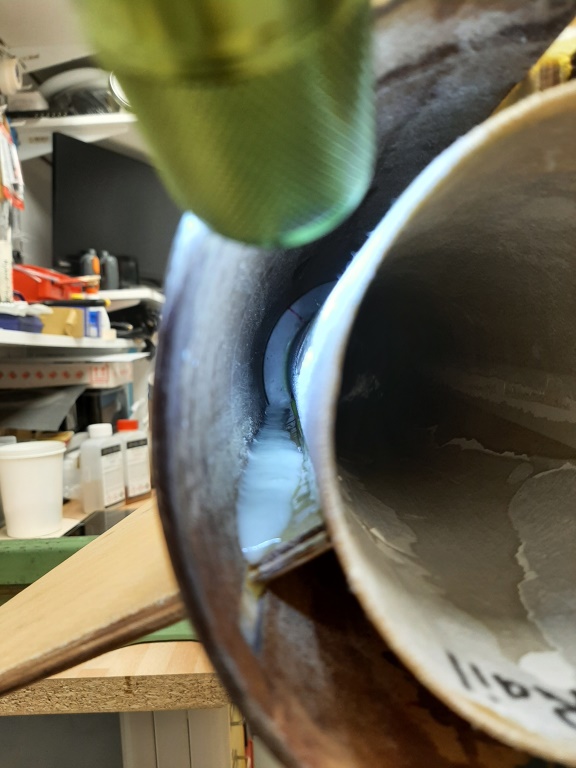 Übrigens der Schwachpunkt im System, die notwendige Verbindungsstelle der beiden Körperrohre, wurde zum zusätzlichen Halt von innen noch mal mit zwei Lagen 180er Aramidgewebe laminiert, das ging bei dem Durchmesser (140mm) und einem langen "Heizungspinsel" recht gut und gibt zusätzlich viel Stabilität... Hier schon mal mit eingebautem Motorrohr,