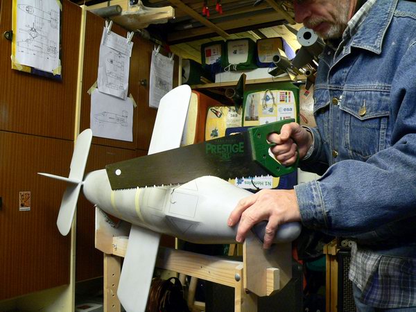 nachdem nun etwas Zeit seit dem ersten Flug verstrichen ist, ich nochmals über alle Probleme nachgedacht habe, ist jetzt der Moment gekommen, wo ich die Säge angesetzt habe. Eigentlich wollte ich erst im nächsten Jahr weiterarbeiten, aber wenn man mal einen Tag frei hat...
