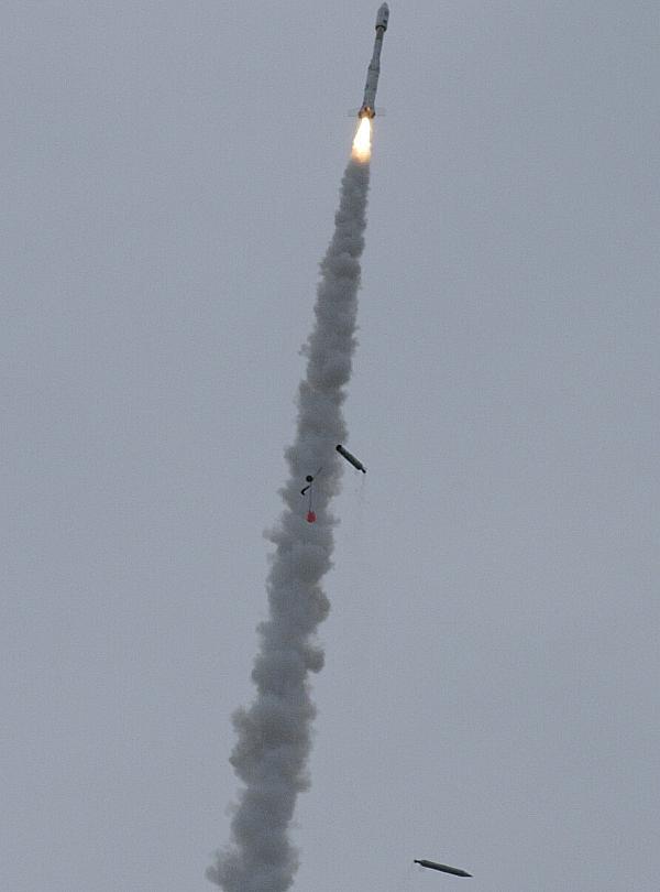 Hier der Abwurf der grossen Booster, Recovery hier perfekt. Auch die Trennung des Main-Boosters und der Payload-Section funktionierte einwandfrei, danach der "freie" Fall an den beiden Droque-Schirmen: Folgende Datei wurde angehängt: