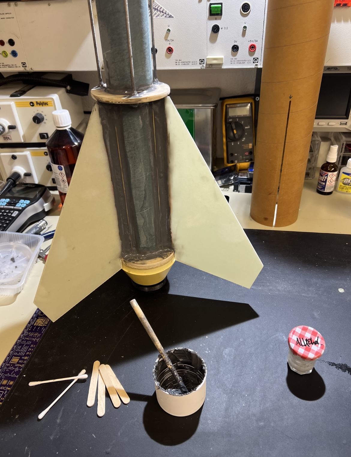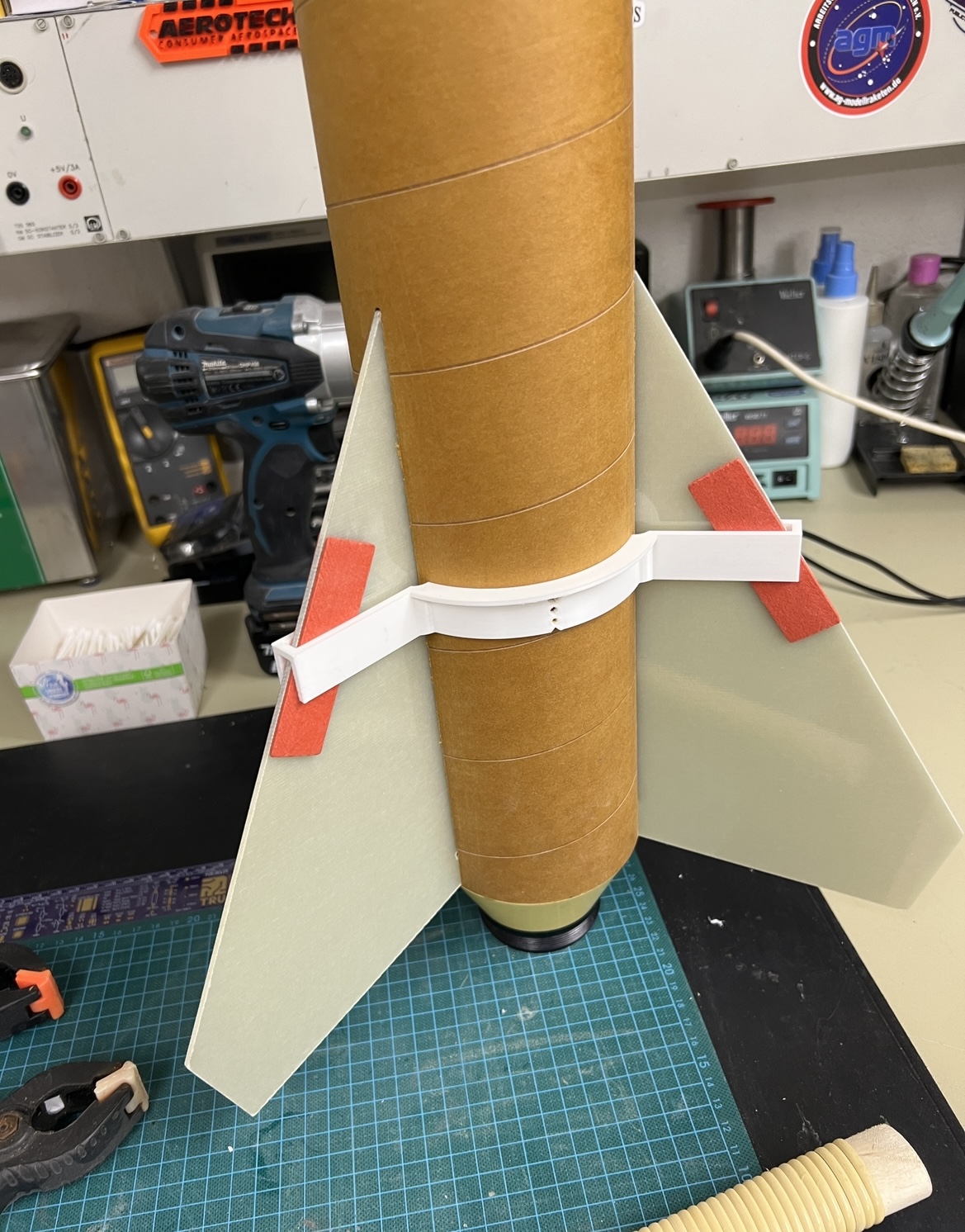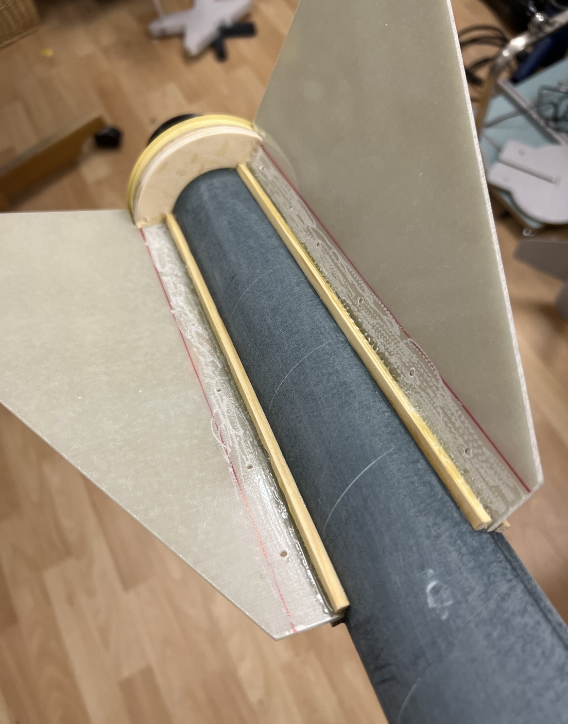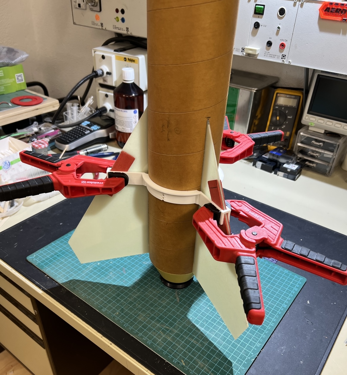 Endlich wurde das untere Körperrohr angebracht … dazu mussten erstmal alle Spante wieder von den Gewindestangen runter da sie den Aussendurchmesser des Couplers entsprechen .. Epoxy im Rohr inneren platziert … epoxy auf allen Klebeflächen aufgetragen … Und alles zusammengefügt … Ich hatte vorher die Finnen mit kleinen Aussparungen versehen um das ganze an den Klebestellen mit Kabelbindern zu fixieren und etwas Kraft auf die Flächen zu bekommen … Diese werden dann später durch die Aussenfillets verdeckt … Alles darf jetzt wieder trocknen … Hier schon mal ein kleiner Ausblick was draus wird :-) Grüße Marco