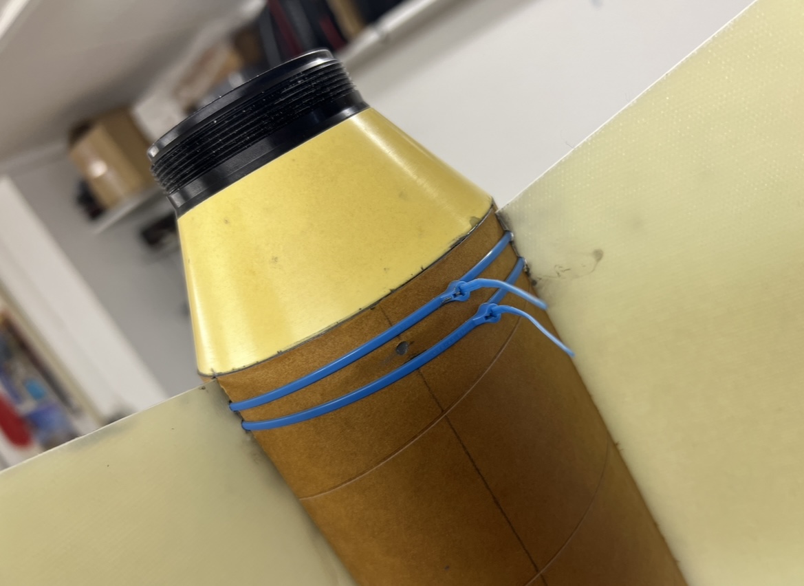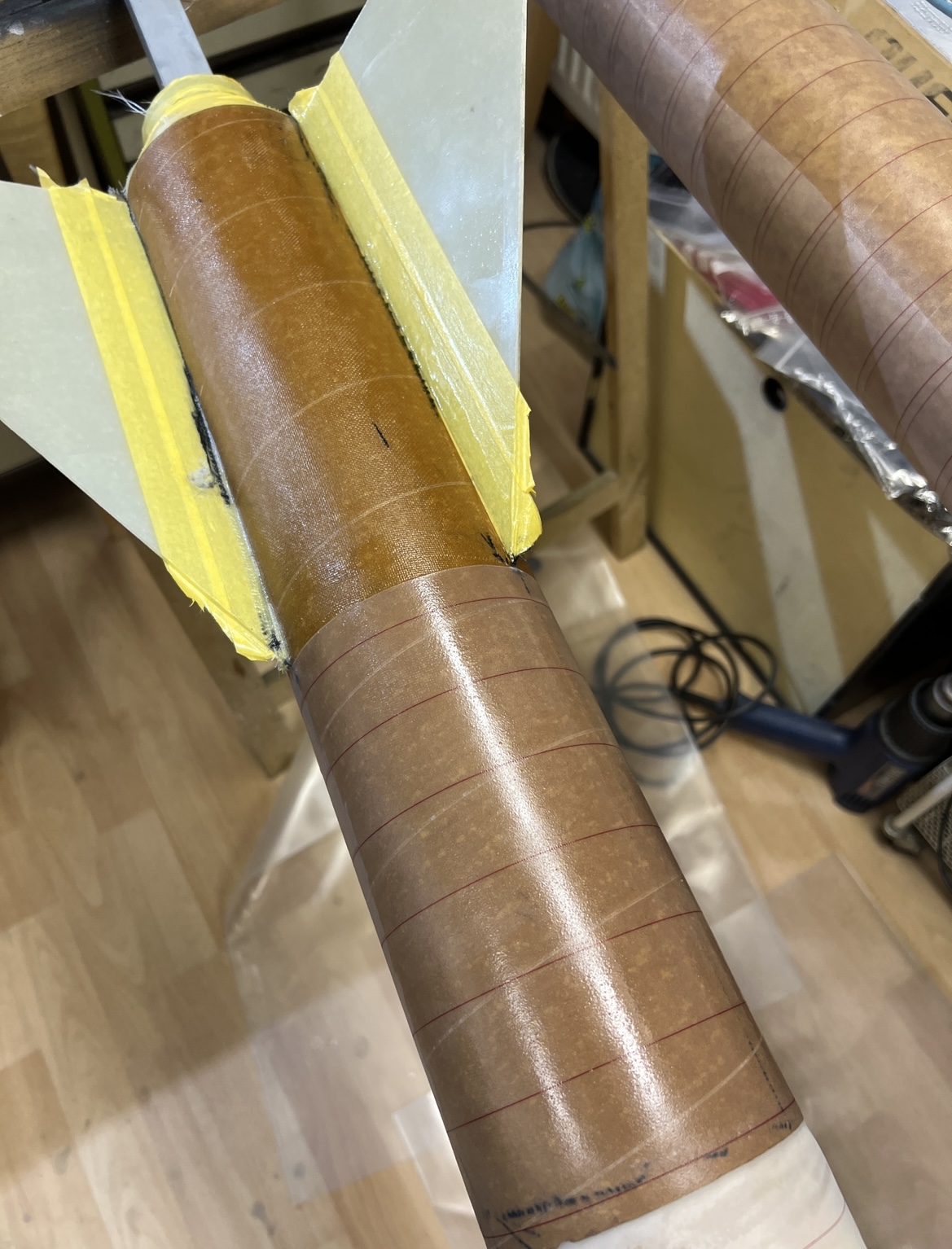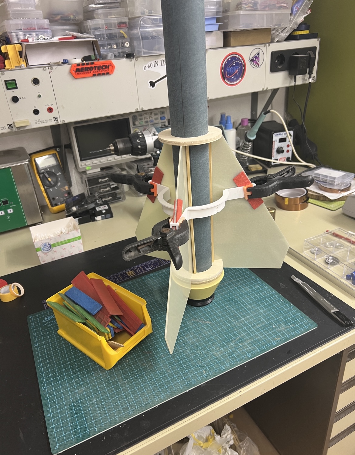 Endlich wurde das untere Körperrohr angebracht … dazu mussten erstmal alle Spante wieder von den Gewindestangen runter da sie den Aussendurchmesser des Couplers entsprechen .. Epoxy im Rohr inneren platziert … epoxy auf allen Klebeflächen aufgetragen … Und alles zusammengefügt … Ich hatte vorher die Finnen mit kleinen Aussparungen versehen um das ganze an den Klebestellen mit Kabelbindern zu fixieren und etwas Kraft auf die Flächen zu bekommen … Diese werden dann später durch die Aussenfillets verdeckt … Alles darf jetzt wieder trocknen … Hier schon mal ein kleiner Ausblick was draus wird :-) Grüße Marco