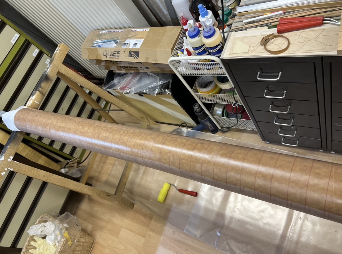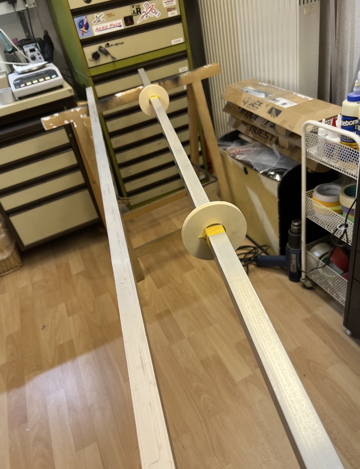 Da hier einige Rohre doch eher Überlänge haben und nicht mehr in meine Laminier Halter passen, die Heck Sektionen die ja jetzt leider schon zusammen gebaut sind mit den Finnen dann nicht mehr drehbar wären … musste eine andere Lösung her … ich habe also einige Ringe geschnitten und alles auf einem Stabilen Alu Vierkant Rohr aufgebaut … das biegt auch bei Belastung nicht durch und es rollt nicht davon auf den Böcken … Die Vorbereitungen für das Verglasen der Rohre / Hecksektionen sind also am Laufen … Grüße Marco