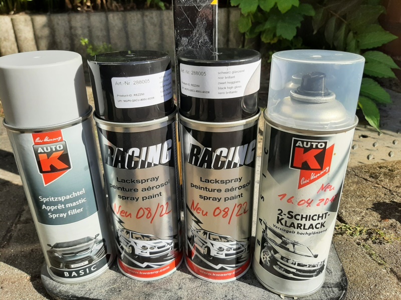 Ein kleiner Tip aber vielleicht zu dem von mir verwendeten Lacken und deren Aufbau. Also ich verwende nur noch den preisgünstigen Dosenlack von AUTO K ( zu finden bei eBay) alles andere habe ich entsorgt...  ! Der Lack von AUTO K lässt sich leicht verarbeiten, deckt sehr gut, neigt nicht zu "Nasenbildung" uns trocknet sehr schnell und vergilbt nicht! Für mein Heckteil habe ich eine Dose (400ml) Spritzspachtel, extra Grundierung fällt dadurch auch weg, 2 Dosen (je 400ml) schwarzen Basislack und eine Dose ( 400ml) Klarlack verwendet und finde das Ergebnis zweckmäßig...;-)! Gesamtkosten ca. 20 Euro, wobei der Spritzspachtel mit ca. 10 Euro das teuerste war. Andreas