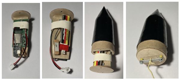 Ich habe hier noch eine sogenannte "Klorollenrakete" mit einem Körperrohr aus dem Kern einer Klorolle, die sogar schon auf dem Sprengplatz der BAM geflogen ist: Man kann sie allerdings nur mit Motoren bis maximal B4-4 fliegen, weil sie sonst mit hoher Wahrscheinlichkeit verloren geht. Da kam mir die Idee, dass man auch hier vielleicht Tracking einsetzen könnte. Entstanden ist dies: Ebenfalls Klorolle, aber der Rumpf ist etwas länger. Zum Tracking: Hier ist eine Variante des Tracking-Senders eingebaut, die etwas kürzer, dafür aber breiter ist und statt einer einfachen Drahtantenne eine Wendelantenne hat. Der GPS Empfänger Beitian BN220 wäre zu groß. Es kommt daher ein kleinerer zum Einsatz. Mit zwei Schrauben wird der Einschub in der Spitze befestigt, womit auch gleich ein Ankerpunkt zur Befestigung des Schockbands zur Verfügung steht. Die Simulation sagt, dass sie mit einem D9 - wenn es denn wieder welche gibt - bei 70 g Leergewicht auf 370 m kommen soll. Der nächste Flugtag wird es zeigen. Gruß Achim